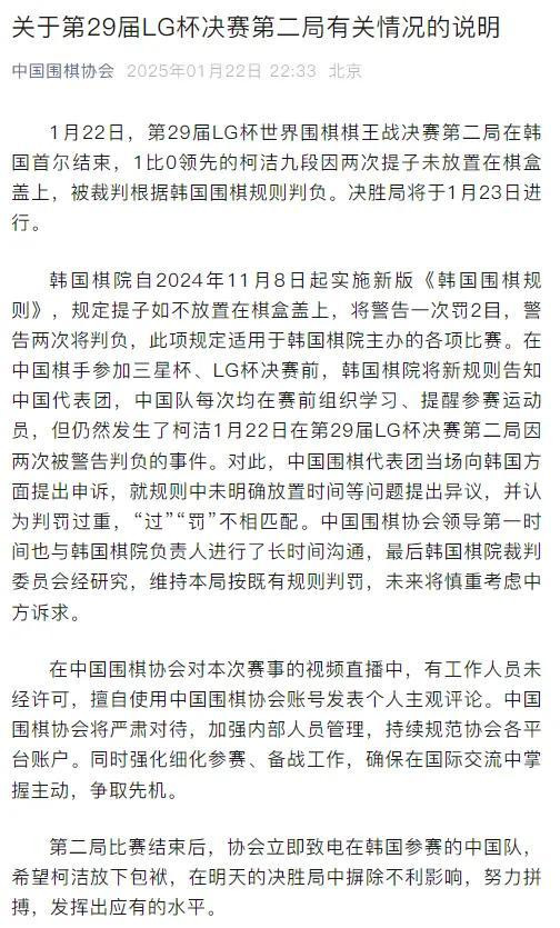 1月22日上午,第29届LG杯世界围棋棋王战决赛第二局柯洁对阵卞相壹,1比0领先的柯洁九段因两次提子未放置在棋盒盖上,被裁判根据韩国围棋规则判负。